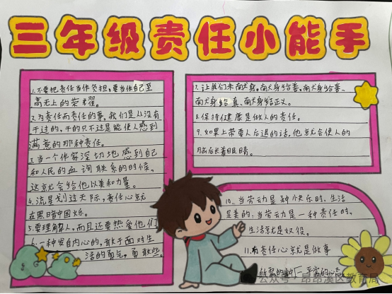 “責任是什么”主題班會上,教師組織學生探討古今中外責任故事,結合校園、家庭場景引導責任判斷;各班精心設計責任主題黑板報,學生積極創(chuàng)作手抄報,營造出濃厚的責任教育氛圍;主題演講比賽中,學生們分享在校園責任崗位、家務勞動、社區(qū)志愿服務中的經歷與感悟,展現責任意識的成長。