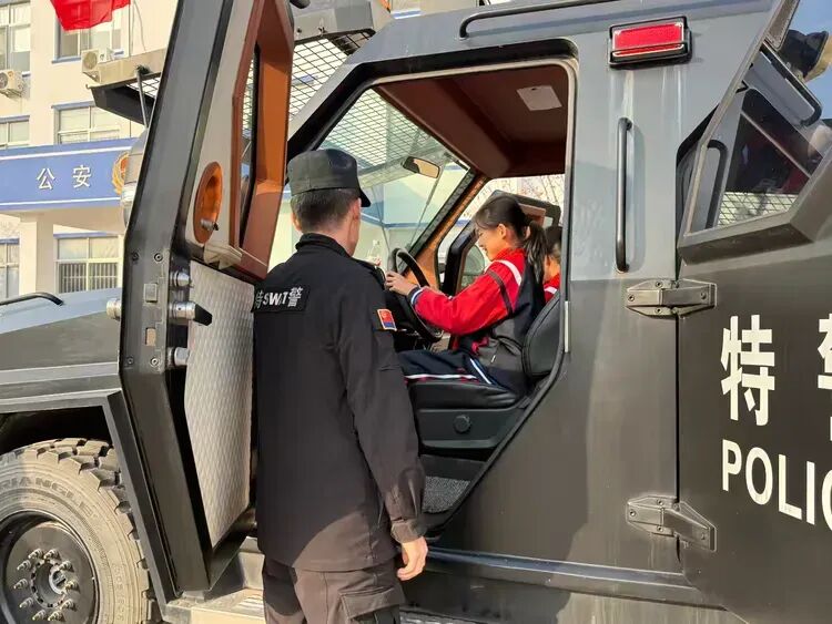 在講解員的帶領(lǐng)下,隊(duì)員們參觀了特警裝備和工作環(huán)境,大家圍攏觀察防毒面具、盾牌、戰(zhàn)術(shù)器械等設(shè)備,好奇中帶著敬畏。一輛黑色裝甲車靜靜停駐,車身寫著醒目的“特警”與“POLICE”,車內(nèi)結(jié)構(gòu)清晰可見,令人感受到現(xiàn)代警務(wù)的專業(yè)與威嚴(yán)。