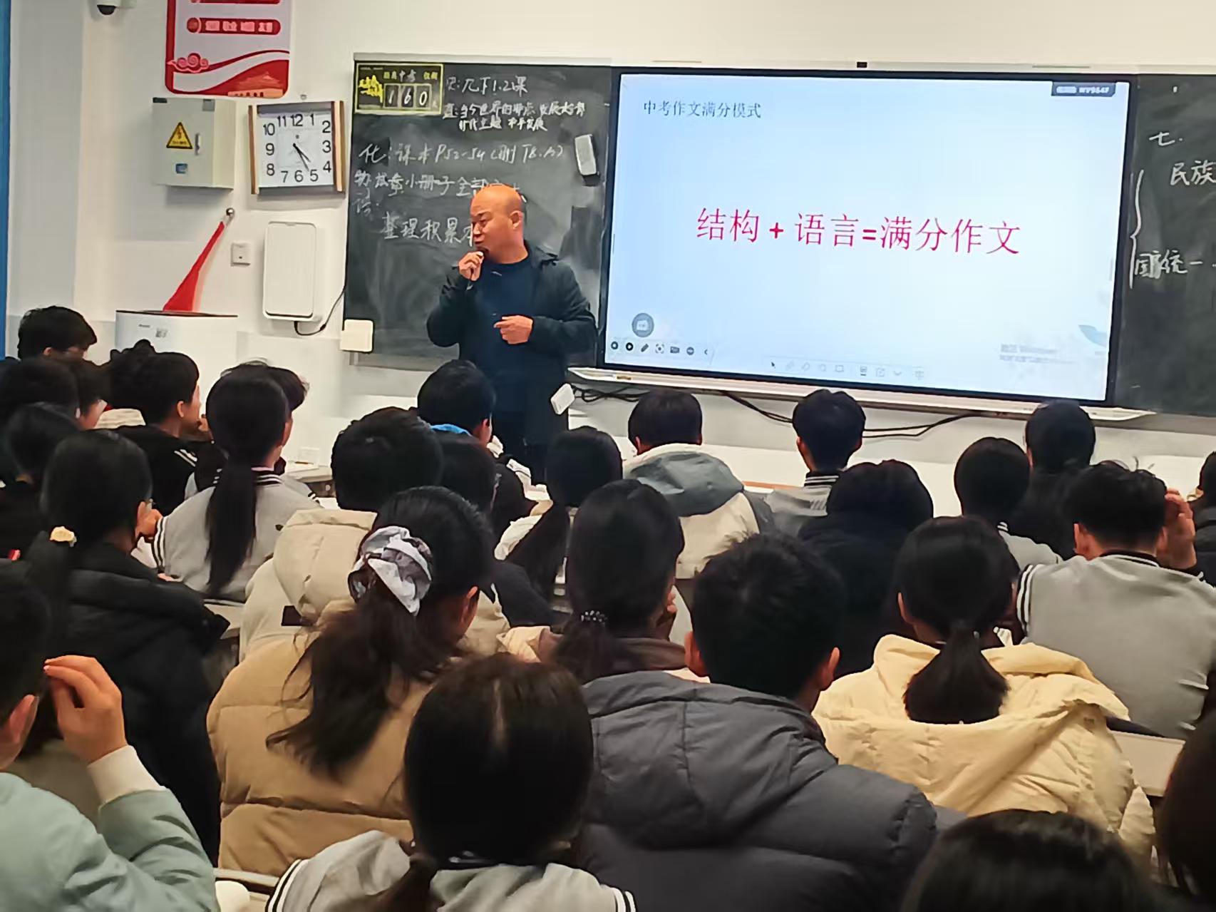 據(jù)了解,講座內(nèi)容圍繞“中考作文滿分模式”逐步展開。郝正波老師指出:中考作文要想得高分,甚至滿分,必須具備兩個(gè)條件:結(jié)構(gòu)技巧和語(yǔ)言表達(dá)。在講述結(jié)構(gòu)技巧時(shí),郝正波老師從“排比式結(jié)構(gòu)”“并列式結(jié)構(gòu)”“遞進(jìn)式結(jié)構(gòu)”“蒙太奇式結(jié)構(gòu)”“書信式結(jié)構(gòu)”中,重點(diǎn)講述了“并列式結(jié)構(gòu)”的表達(dá)技巧,結(jié)合例文給學(xué)生分析并列式結(jié)構(gòu)技巧的形成思路,以及組織語(yǔ)言的常見幾種方式:……是……,……有……,……成為……。