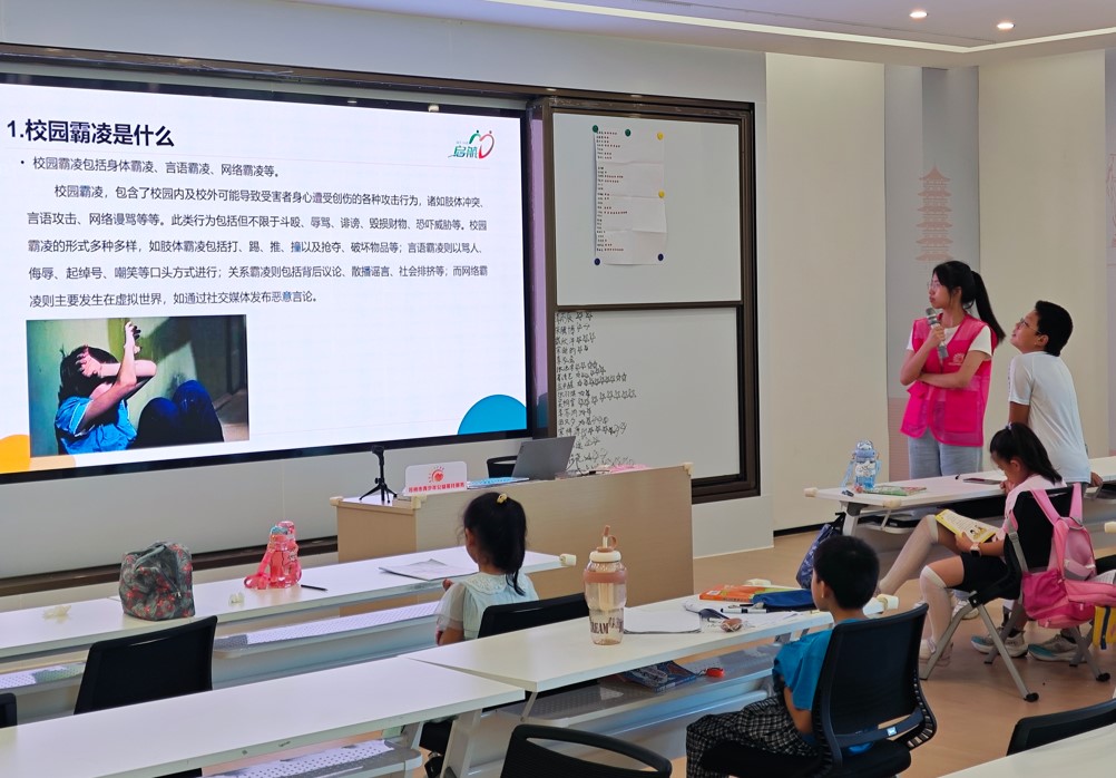 為增強(qiáng)青少年的自我保護(hù)意識(shí),營(yíng)造安全健康的成長(zhǎng)環(huán)境,8月4日下午,江蘇省太倉(cāng)市婁東街道婁江社區(qū)校外教育輔導(dǎo)站,組織孩子們正在開(kāi)展“向校園霸凌說(shuō)不”校園霸凌防治課活動(dòng)。