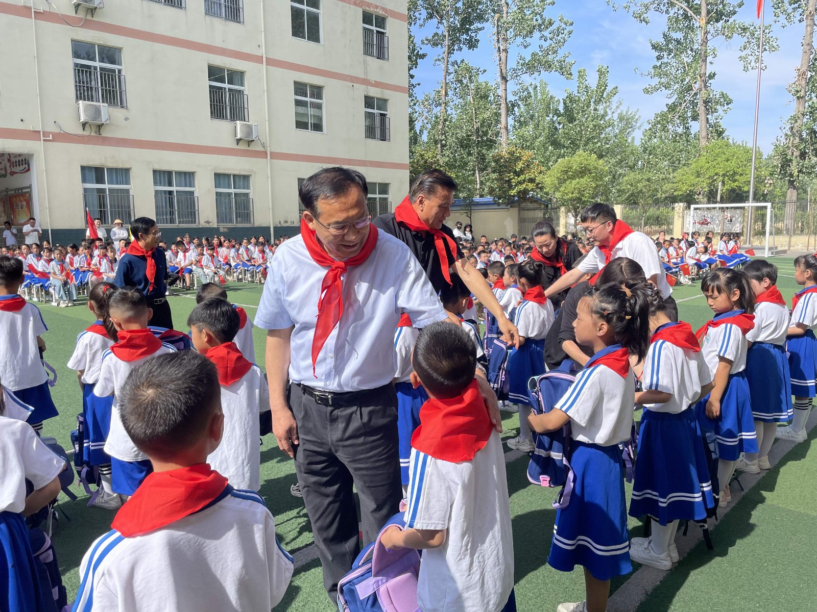在王店小學,少先隊員們熱情地為楊彥穎一行系上鮮艷的紅領巾,少先隊新隊員入隊儀式在雄壯的進行曲中拉開帷幕。學生和家長代表發(fā)言、宣誓……37名一年級學生光榮地加入了少先隊集體,成為少先隊的新生力量。