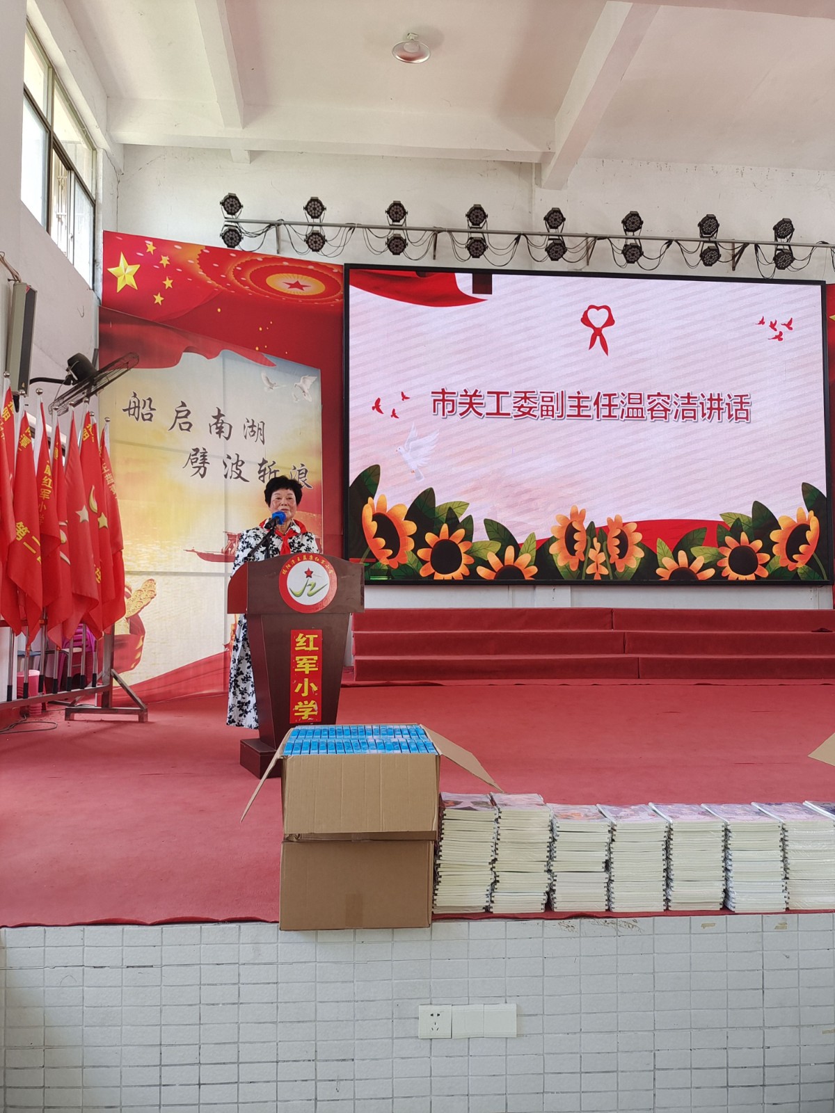 揭陽(yáng)市關(guān)工委副主任溫容潔向少年學(xué)生表示節(jié)日的祝賀,向辛勤勞動(dòng)的“園丁們”表示崇高的敬意,對(duì)揭陽(yáng)市慧護(hù)社會(huì)工作服務(wù)中心為關(guān)心下一代慷慨解囊的善舉表示衷心感謝。慰問(wèn)活動(dòng)上,溫容潔在高度贊賞紅軍小學(xué)授牌以來(lái)所取得的教育成果和各項(xiàng)榮譽(yù)的同時(shí),希望學(xué)生要珍惜今天來(lái)之不易的美好生活環(huán)境和優(yōu)越學(xué)習(xí)環(huán)境,樹(shù)立遠(yuǎn)大理想、養(yǎng)成優(yōu)良品德、練就過(guò)硬本領(lǐng)、鍛煉強(qiáng)健體魄,做德智體美勞全面發(fā)展的時(shí)代新人。同時(shí),勉勵(lì)老師們繼續(xù)以廣博知識(shí)哺育學(xué)生,用高尚精神熏陶學(xué)生,為揭陽(yáng)高質(zhì)量發(fā)展培養(yǎng)更多優(yōu)秀人才。也希望各級(jí)黨政及社會(huì)各界更加關(guān)注關(guān)愛(ài)青少年工作,努力營(yíng)造青少年健康成長(zhǎng)的良好氛圍。