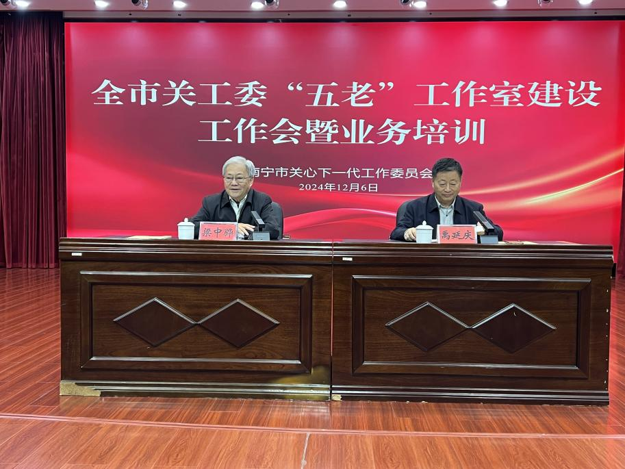 12月5日至6日,廣西壯族自治區(qū)南寧市關(guān)工委“五老”工作室建設(shè)工作暨業(yè)務(wù)培訓(xùn)會在南寧市老干部活動中心召開。市關(guān)工委主任梁中驊出席會議并講話。市關(guān)工委常務(wù)副主任禹延慶主持會議。市關(guān)工委駐會領(lǐng)導(dǎo)、各縣(市、區(qū))關(guān)工委領(lǐng)導(dǎo)及辦公室負(fù)責(zé)人、“五老”工作室代表負(fù)責(zé)人及南寧市關(guān)心下一代大講堂法治宣講員代表40余人參加會議。