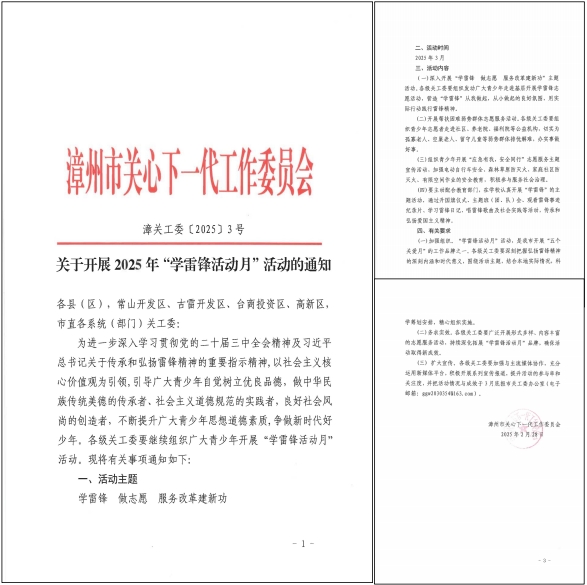 2月28日,漳州市關(guān)工委下發(fā)文件,組織全市各級關(guān)工委開展2025年“學(xué)雷鋒 做志愿 服務(wù)改革建新功”為主題的“學(xué)雷鋒月”活動。