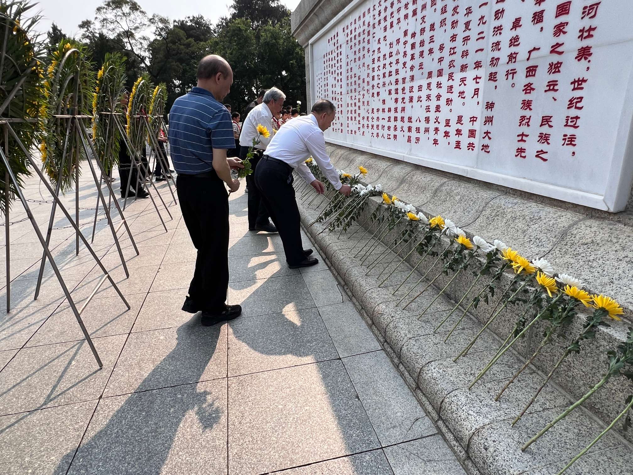在《獻花曲》中,市關(guān)工委主任梁中驊,自治區(qū)黨委老干部局機關(guān)黨委書記朱林,興寧區(qū)關(guān)工委主任羅思義,南寧市衛(wèi)校黨委書記黨委委員、人事科科長張曲濤,安寧路小學黨委書記、校長蒙桂英上前整理緞帶,全體人員向革命先烈三鞠躬。隨后,所有人員依次獻花。悼念儀式結(jié)束后,全體人員依次參觀了毛主席接見廣西各族人民紀念館。豐富的歷史資料和珍貴文物,讓大家深刻感受到革命先輩的偉大精神和愛國情懷。