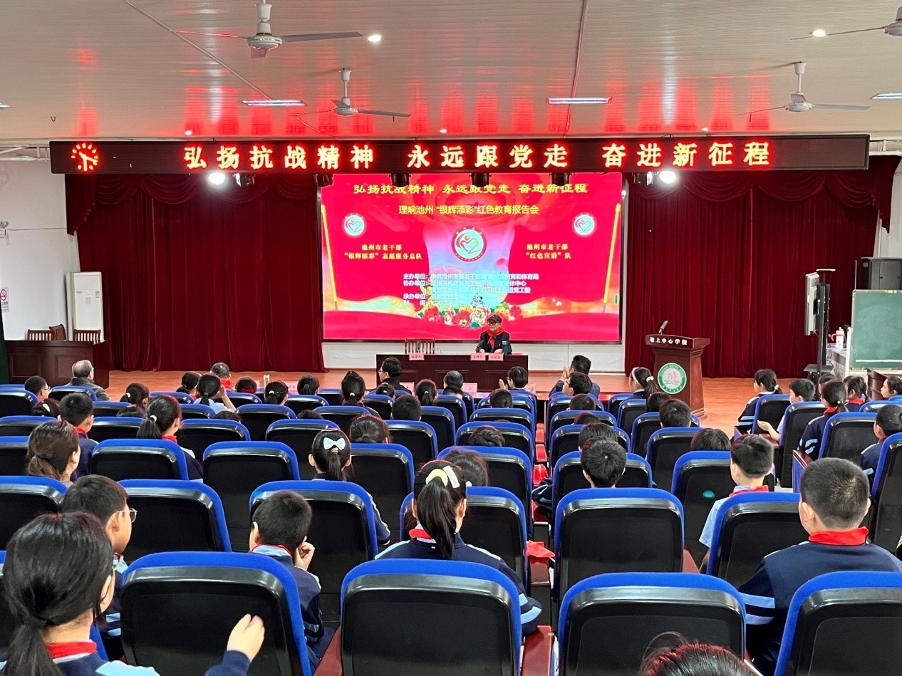 報告會由池州市民政局關(guān)工委常務(wù)副主任、市民政局德教報告團團長、池州市銀輝添彩紅色宣講隊隊長孫曉勇主持。貴池區(qū)墩上中心學校副校長施天鴻致歡迎詞。市委老干部局、市民政局關(guān)工委、市教育體育局關(guān)工委、市老干部活動中心、市軍休中心、貴池區(qū)老干部服務(wù)中心、墩上街道黨工委、墩上中心學校等部門負責同志出席報告會,貴池區(qū)墩上中心學校五年級300名學生參會聽報告。