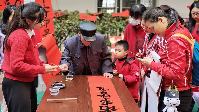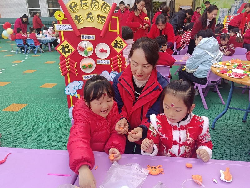 在這穿紅衣、趕廟會,喜氣洋洋,年味兒濃厚、歡樂祥和的氛圍里家長們帶著自己的孩子穿梭在廟會活動中。廟會活動共設置了多個游藝場地,各種活動精彩匯集,有團團圓圓年夜飯、書“?!庇履?、喜慶燈籠、剪窗花捏泥人等多種活動形式。音樂起吉時到,家長和孩子們歡歡喜喜慶新年,妙趣橫生逛廟會!
