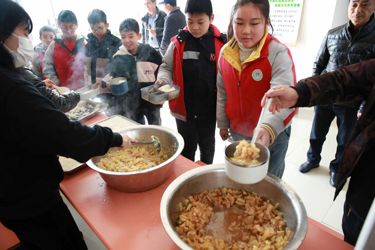蘿卜燒肉、肉沫粉絲、雞蛋湯……1月2日中午,彭澤縣芙蓉農(nóng)場小學(xué)午飯開餐時,廚房里熱氣騰騰,食堂的空氣中彌漫著飯菜的香味,學(xué)生在老師的指導(dǎo)下排隊打飯、打菜,在食堂里大口大口地吃著香噴噴的飯菜,個個吃得津津有味、眉開眼笑,心里有說不出的高興。