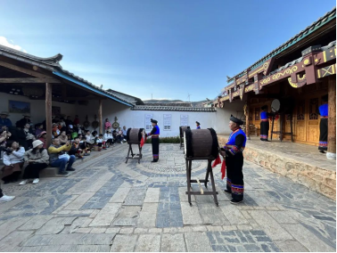為更充分體驗彝族風(fēng)情,學(xué)生們換上了當(dāng)?shù)靥厣褡宸?,跟著村上關(guān)工委志愿者步伐,共同步入迤沙村史館展館,詳細(xì)了解全村人物風(fēng)貌、發(fā)展軌跡、建設(shè)成果、民俗文化等的滄桑歷史;在村巷中,探究百年彝族古建筑記錄下的歲月更迭?!霸诹私猱?dāng)?shù)刭殿H彝族民俗和獨特地域特色的過程中,我們還進(jìn)行尋‘寶’游戲,通過尋找古建筑構(gòu)件、學(xué)習(xí)一句彝語、了解當(dāng)?shù)匦帐衔幕葍?nèi)容完成打卡,在游戲互動中,對迤沙拉的認(rèn)識也得到了進(jìn)一步加深。”重慶市沙坪壩區(qū)學(xué)生呂若彤說道。在迤沙拉非遺小院,《迤啊·迤沙拉》情景演出驚艷亮相,吸引團(tuán)隊前往感受特色民族的“力”與“美”;徒步鄉(xiāng)間山道,體驗趕羊上山的農(nóng)事樂趣,在位于金沙江畔海拔1650米處金沙江大峽谷觀景臺,覽峽谷奇觀、觀江水奔涌;學(xué)習(xí)彝繡、制作羊皮鼓,在村上手藝人的帶領(lǐng)下,學(xué)生們一針一線體驗傳統(tǒng)非遺手工魅力;夜色降臨,簇?fù)眢艋?、載歌載舞,沉浸式體驗民族文化風(fēng)韻。