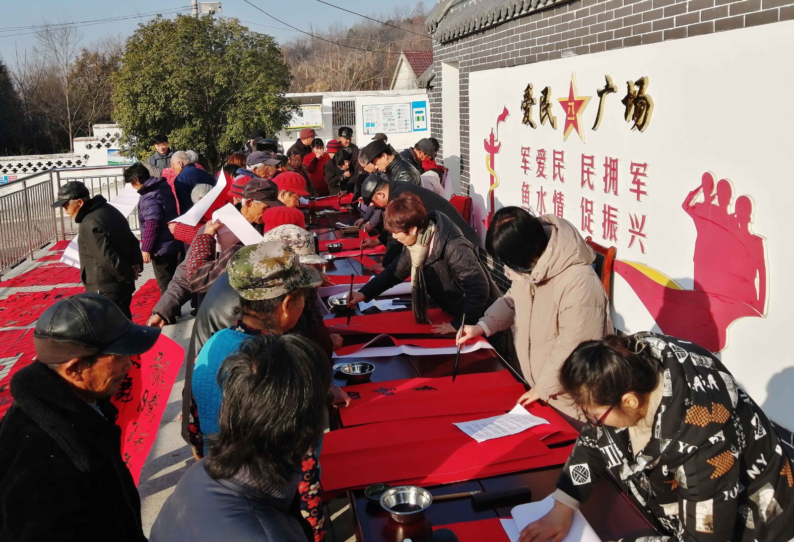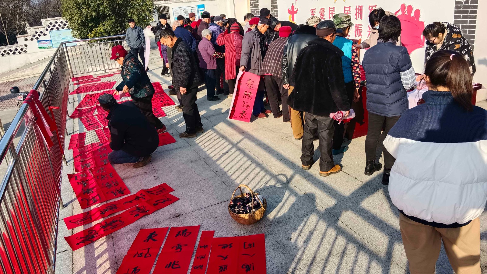 在村愛民廣場(chǎng),書法家們飽含深情書寫一幅幅寓意美好愿望的春聯(lián),聞?dòng)嵹s來(lái)的鄉(xiāng)親們把書寫春聯(lián)的工作臺(tái)圍得水泄不通,都希望能得到書法家們手書的春聯(lián)。