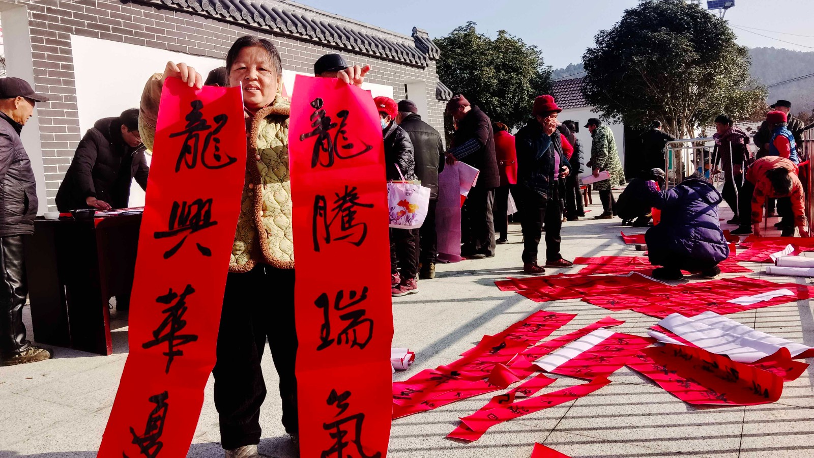 祝福的話語(yǔ)在書法家們的筆尖流淌。墨跡未干的春聯(lián)被村民們匆匆拿走了,村民們邊曬春聯(lián)、邊欣賞著,喜悅之情溢于言表。文化廣場(chǎng)鋪滿著寫好的春聯(lián),這里成了紅色的海洋,為即將到來(lái)的春節(jié)增添了濃濃的喜慶氛圍。村民靳小芳說(shuō):“今年將是龍年,我特意選了帶‘龍’字的春聯(lián),祝孫子們?cè)谛碌囊荒昀锷眢w生龍活虎,學(xué)習(xí)成績(jī)龍騰虎躍,步步高!”