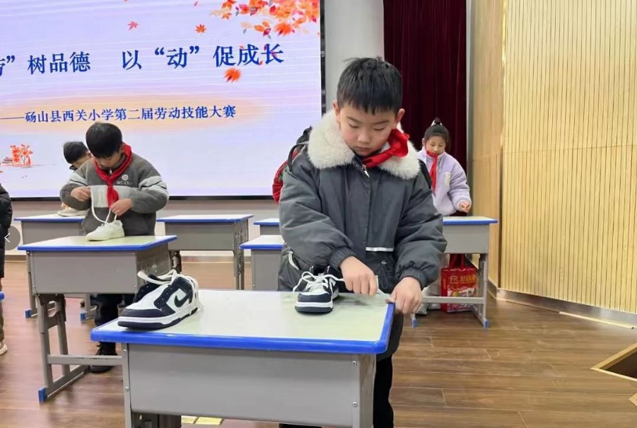 碭山縣西關(guān)小學(xué)根據(jù)學(xué)生年齡特點(diǎn),為各年級(jí)量身制定了不同的比賽項(xiàng)目:一年級(jí)剝蒜比賽、三年級(jí)系鞋帶比賽、五年級(jí)釘紐扣比賽,旨在提高學(xué)生的動(dòng)手能力與生活自理能力。