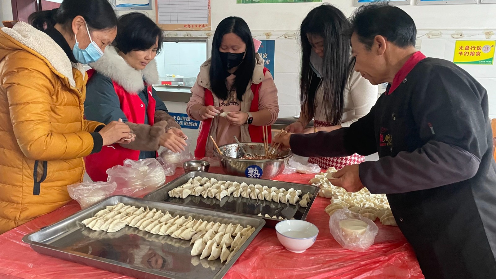 一大早,志愿者們就開始了準(zhǔn)備工作,將餃子皮、肉餡準(zhǔn)備好,隨后把前一天浸泡好的紅豆、黃豆以及黑米、薏米、花生等食材沖洗干凈后按比例倒入鍋中。志愿者們圍在一起,邊包餃子邊聊家常。大家各顯身手,餃子皮在一雙雙巧手下大變身,形態(tài)各異的餃子一一呈現(xiàn)在眼前,不僅有經(jīng)典的月牙水餃甚至還有元寶形狀。
