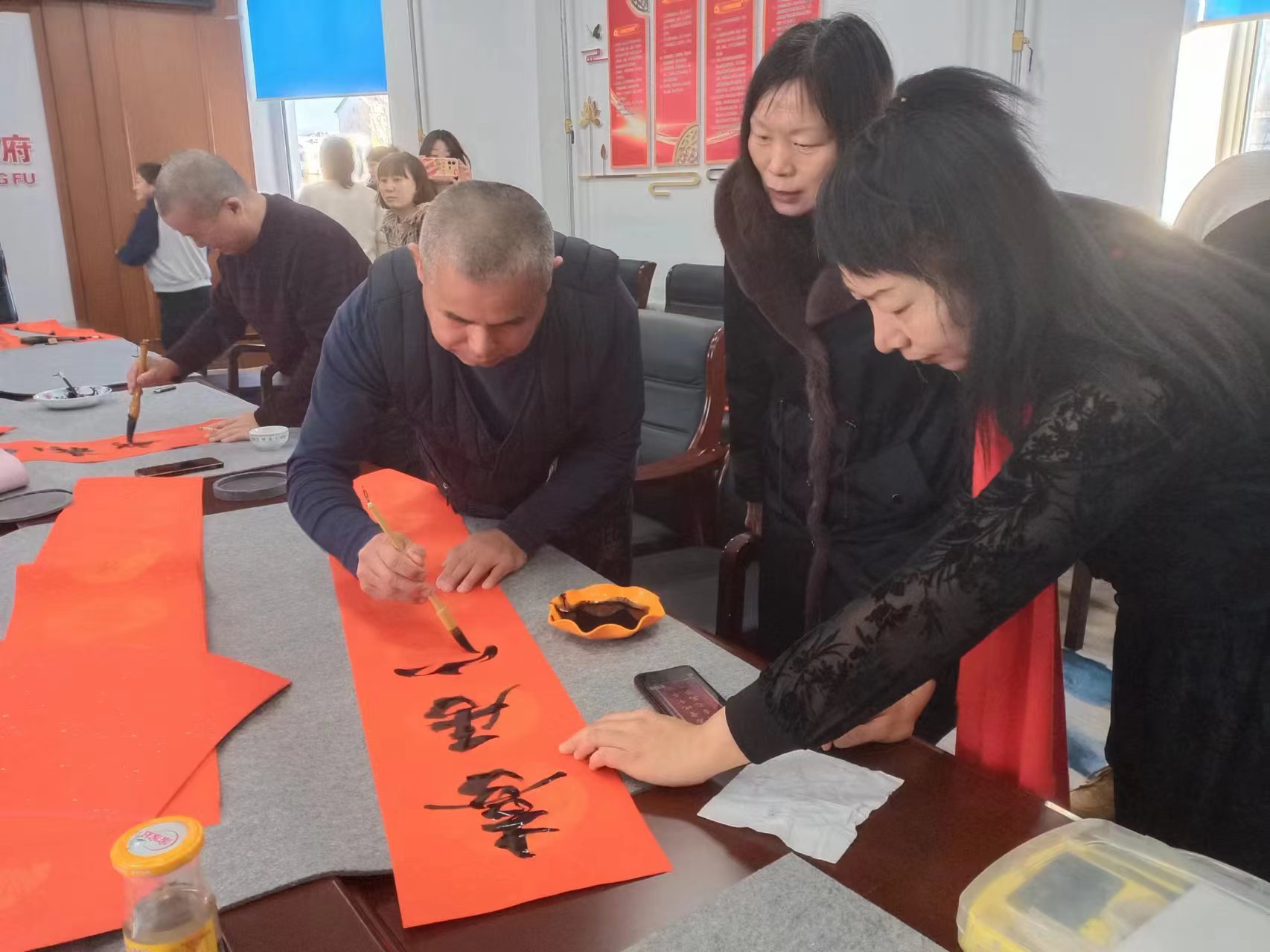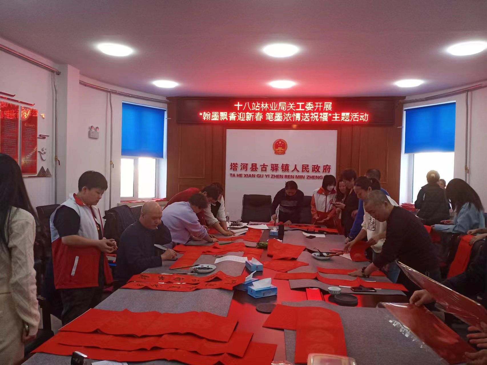 1月30日,在春節(jié)來(lái)臨之際,十八站林業(yè)局關(guān)工委組織書(shū)法協(xié)會(huì)的7名“五老”書(shū)法家開(kāi)展“翰墨飄香迎新春,筆墨濃情送祝?!敝黝}活動(dòng),書(shū)法老師在現(xiàn)場(chǎng)開(kāi)展寫對(duì)聯(lián)、迎新春、送祝福活動(dòng),在翰墨飄香中給古驛站“五老”及職工群眾送去新春的祝福?;顒?dòng)現(xiàn)場(chǎng)熱鬧非凡,職工群眾在領(lǐng)取春聯(lián)的同時(shí),也領(lǐng)略到了書(shū)法的魅力。也吸引了不少“五老”及職工群眾前來(lái)觀看,書(shū)法家們?yōu)椤拔謇稀奔奥毠と罕姇?shū)寫春聯(lián)、畫(huà)年畫(huà),一幅幅對(duì)仗工整、寓意吉祥的春聯(lián)和一幅幅精美的年畫(huà),洋溢著新春的喜氣,寄托著新春的美好祝福。大家圍在自己心儀的“書(shū)法家”前排隊(duì)等候,一邊挑選著自己心儀的作品,一邊欣賞著書(shū)法創(chuàng)作,品評(píng)春聯(lián)寓意。