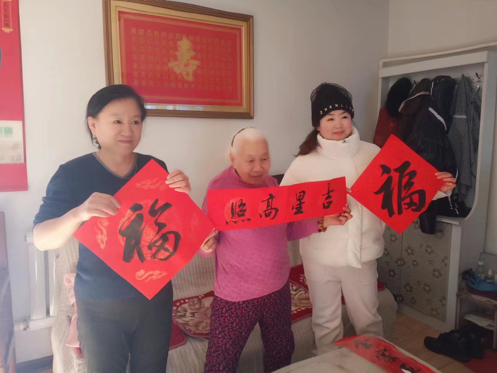 志愿者們還將“新鮮出爐”的春聯(lián)排列開(kāi)來(lái),整理晾干后送到職工及獨(dú)居老人的手中,拿到心儀春聯(lián)的“五老”及職工群眾們喜悅之情溢于言表,紛紛表示,“手寫春聯(lián)比印制春聯(lián)更有溫度、更有意義!”