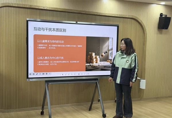 分享中,孫丹老師明確有效互動的核心是觀察兒童信號再回應(yīng)、使用兒童視角語言并留出思考間隙,而互動與干擾的本質(zhì)區(qū)別在于是否以兒童需求為導(dǎo)向。她詳細(xì)介紹了關(guān)鍵方法:先觀察兒童行為軌跡、解讀非語言信號并識別興趣焦點(diǎn),再用具象化詞匯、生活場景融入及短句重復(fù)的兒童語言溝通,同時強(qiáng)調(diào)成人應(yīng)做追隨者而非主導(dǎo)者,調(diào)整節(jié)奏適應(yīng)兒童。在理念落地部分,孫丹老師分享了觀察需遵循不打斷、多維度記錄和尊重個體差異原則,傾聽則要做到蹲姿平視、復(fù)述確認(rèn)并放下手機(jī)專注投入。通過有效互動與無效干擾的案例對比,老師們更直觀地理解了同頻互動的實(shí)踐要點(diǎn)。聽著孫老師的分享,幼兒園的老師們收獲頗豐,深刻認(rèn)識到與兒童相處需先觀察再行動,避免以成人意志主導(dǎo)孩子的活動。大家學(xué)會了識別互動中的干擾行為,掌握了用兒童視角溝通、共情回應(yīng)情緒等實(shí)用技巧,明白蹲姿傾聽、耐心等待等細(xì)節(jié)能有效保護(hù)孩子的專注力與創(chuàng)造力。漢王鎮(zhèn)中心幼兒園的老老師們表示,將把所學(xué)運(yùn)用到日常教學(xué)中,多關(guān)注孩子的行為信號與個體差異,以追隨者的姿態(tài)構(gòu)建真正同頻的互動關(guān)系,減少不必要的干擾,助力孩子自主探索與成長。