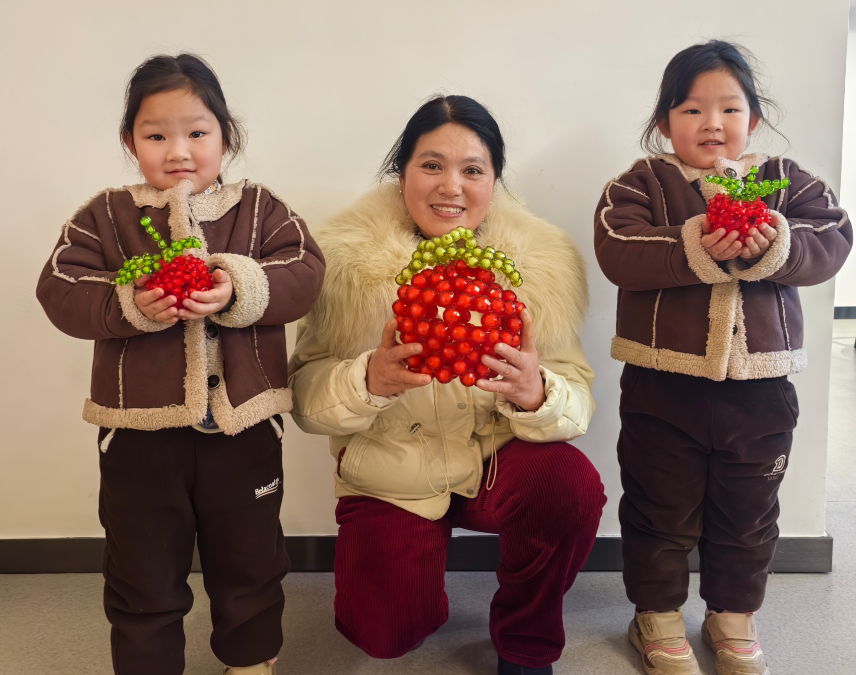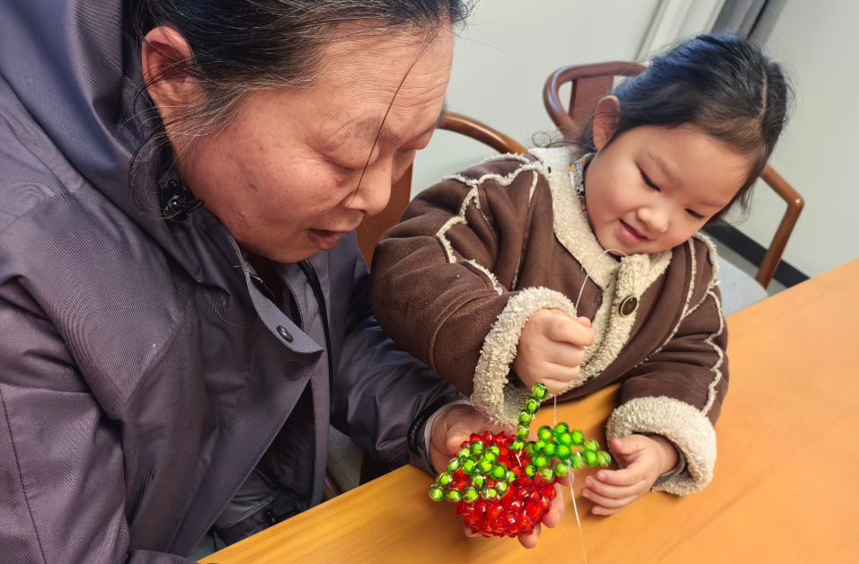 活動現場,社區(qū)志愿者化身指導老師,從串珠的穿線技巧、配色搭配到蘋果造型的拼接方法,逐一為孩子們講解示范。孩子們興致盎然地拿起珠子和絲線,跟著步驟認真操作,遇到難題時主動向志愿者和身邊長輩請教。在大家的努力下,一顆顆紅、綠珠子被巧妙串聯,變成了精致的蘋果串珠擺件。孩子們捧著親手制作的作品,臉上滿是自豪與喜悅,現場洋溢著溫馨歡樂的氛圍。