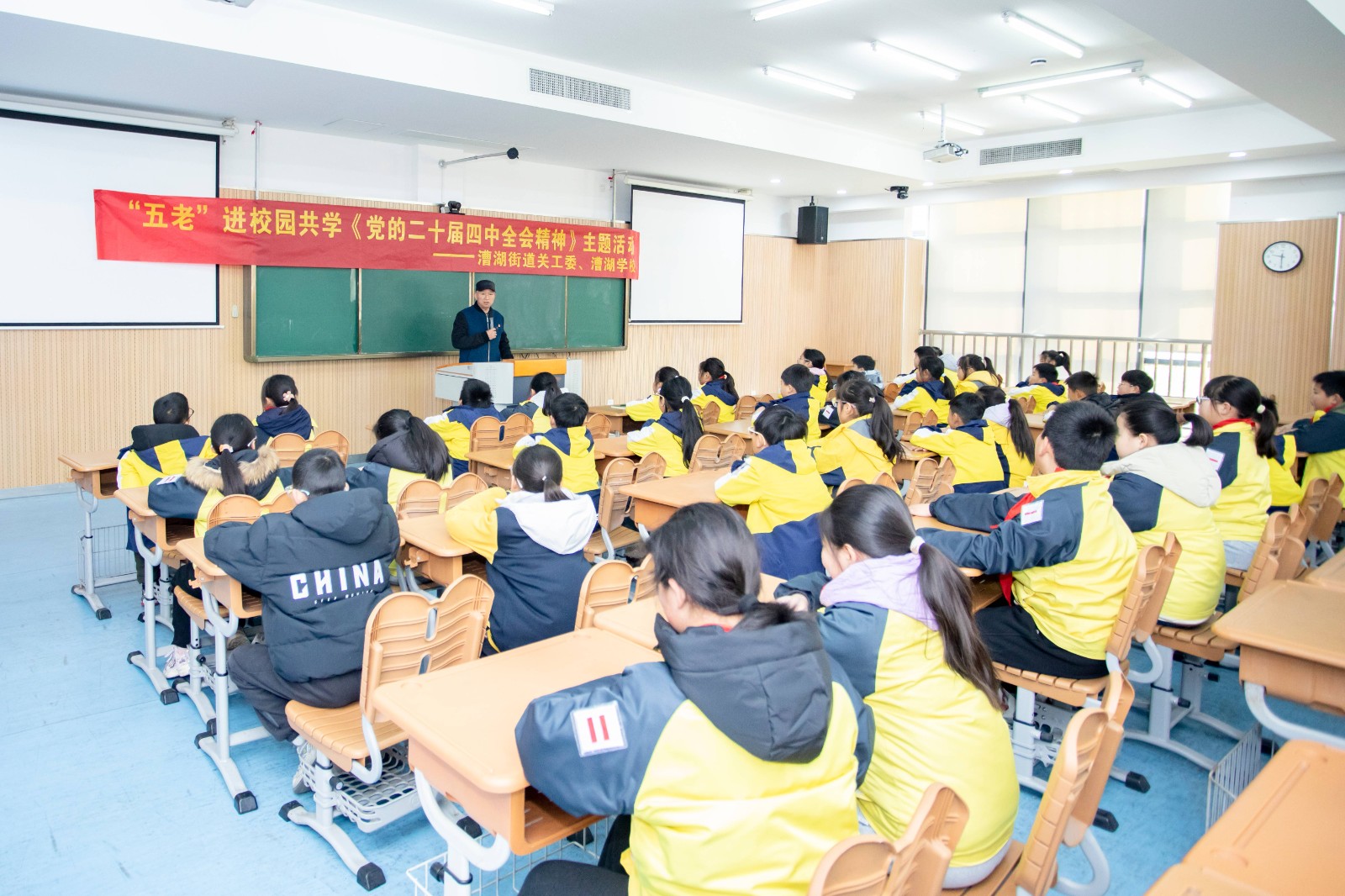 1月13日上午,蘇州市相城區(qū)漕湖街道關(guān)工委聯(lián)合漕湖學(xué)校組織“五老”進(jìn)校園共學(xué)《黨的二十屆四中全會(huì)精神》的主題活動(dòng)。街道“五老”錢三男同志帶領(lǐng)學(xué)生在階梯教室集中學(xué)習(xí)《黨的二十屆四中全會(huì)精神》,傳承紅色基因薪火,培育青少年愛(ài)國(guó)情懷,筑牢思想根基。