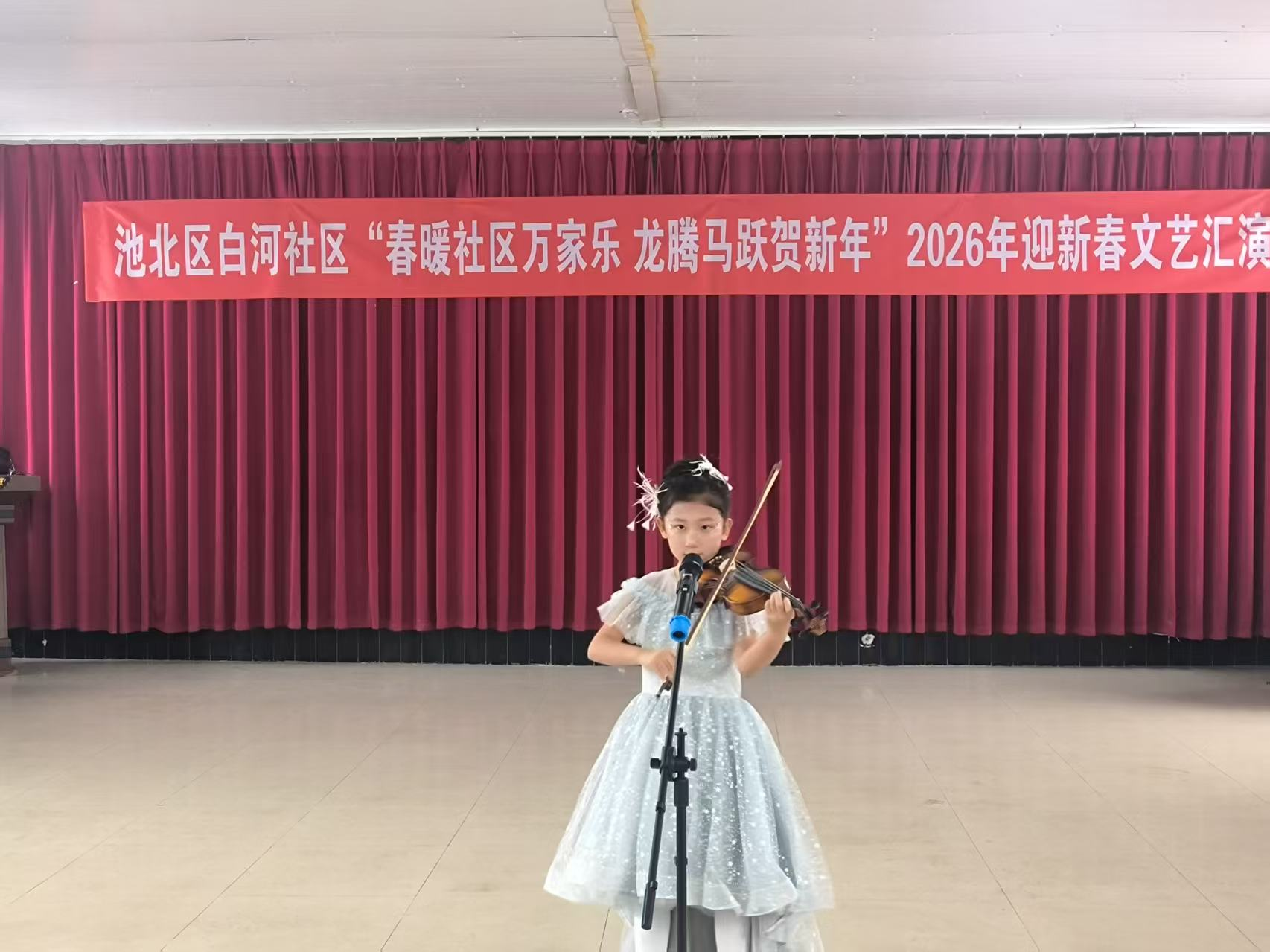 本次活動在歡快的舞蹈《福到我家》中拉開序幕。首先登場的是兒童小提琴獨奏《新春樂》,稚嫩的臉龐洋溢著純真笑容,活潑靈動的音樂仿佛春風拂過,瞬間點燃了現場的氣氛,掌聲不斷。二重唱《我和我的祖國》是本次匯演的一大亮點,兩位居民歌手配合默契,歌聲溫暖質樸,唱出了社區(qū)居民對美好生活的向往,也唱出了對祖國的深深熱愛,引發(fā)了在場觀眾的強烈共鳴。此外,廣場舞、紅歌連奏等節(jié)目輪番登場,充分展現了白河社區(qū)居民積極向上的精神風貌和豐富多彩的文化生活。
