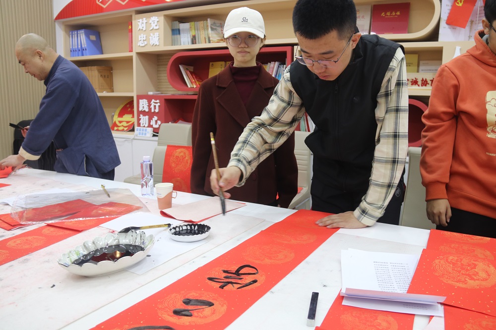 在校大學(xué)生志愿者徐銘澤同學(xué)與老書法家志愿者們力道潑墨,博得贊語。
