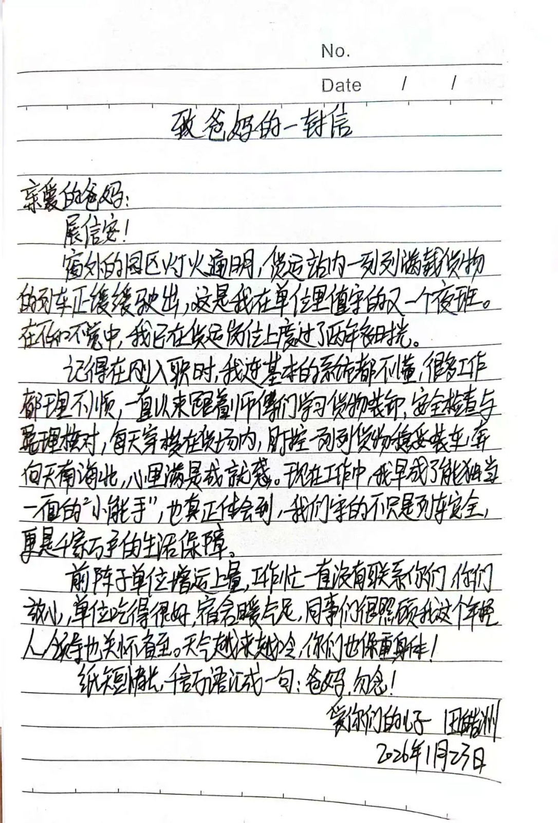 一紙家書,載萬千思念一份責任,保一路平安,包頭鐵路物流中心的青年職工將家書傳遞出的溫暖力量,化作貨運人的堅守與擔當扎根崗位、履職盡責在新春到來前夕以家書寄情,以堅守踐諾讓青春在貨運一線閃光。