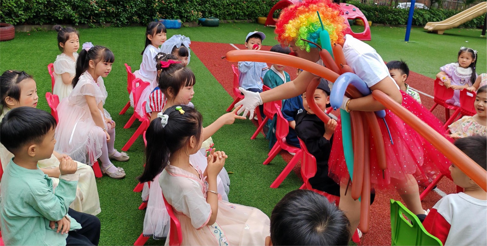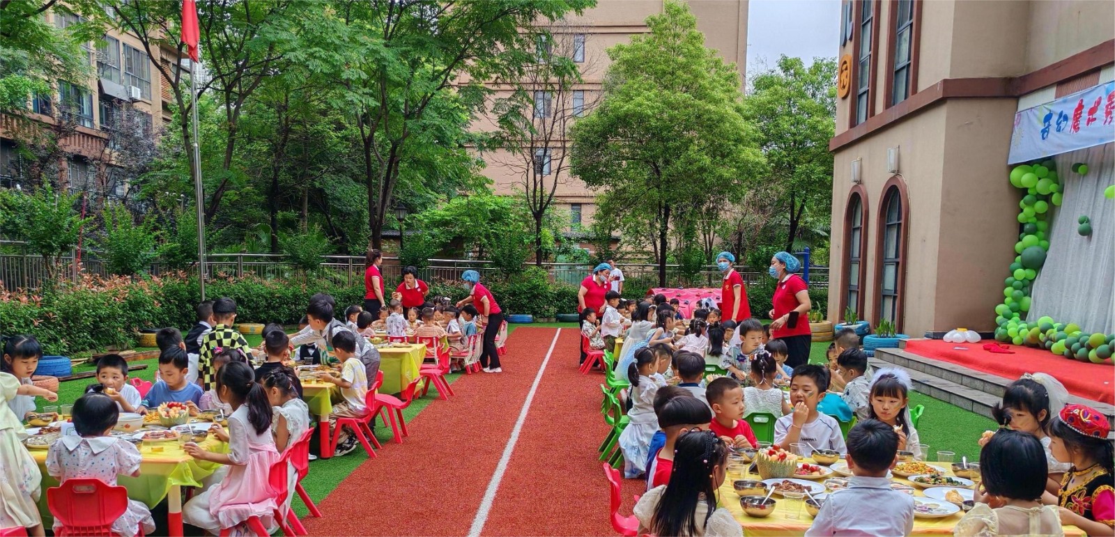 活動主要有小丑魔術表演、吃大席、音樂狂歡等環(huán)節(jié)。當音樂響起,小丑魔術師精彩的表演、神奇的道具,深深吸引了孩子們的眼球,令所有孩子們都興奮不已,滑稽的小丑打扮奇特,并熱情地與臺下的孩子們互動,深受孩子們的喜愛,加之富有童趣的旋律,引來了全場的高潮;吃大席開始,社區(qū)工作人員、老師們給孩子端來一盤盤的美食,孩子們興奮地挑選著自己喜歡的美食,快樂的享受著美食,整個活動自主有序,體現(xiàn)了孩子們文明的用餐禮儀。通過豐富多彩的活動,讓孩子們在歡聲笑語中,度過了一個快樂有趣且有意義的六一兒童節(jié)。