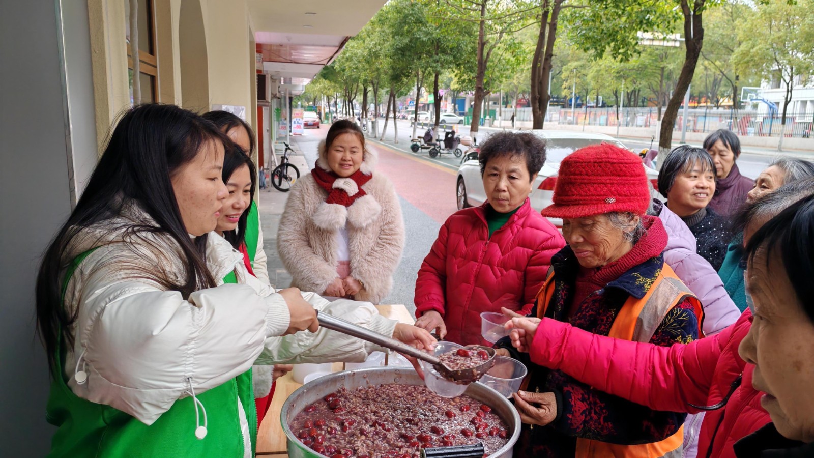 活動當(dāng)天,社區(qū)工作人員將提前泡好的臘八粥食材進(jìn)行熬制,經(jīng)過兩個多小時的文火慢熬,香氣撲鼻的臘八粥出鍋了。并在幸福食堂門口設(shè)置點(diǎn)位,現(xiàn)場為居民發(fā)放臘八粥,居民們在志愿者的引導(dǎo)下有序排隊領(lǐng)取,盡管只是一碗小小的粥,但捎去的是社區(qū)帶給居民的關(guān)愛和問候,是暖到居民心窩里的溫情和祝福,居民手里拿著香氣撲鼻的臘八粥,個個臉上都洋溢著燦爛幸福的笑容。同時,志愿者還為轄區(qū)內(nèi)行動不便的老人開展了特別的“粥”到服務(wù),把帶著溫暖和祝福的粥送到居民家中。