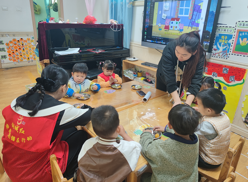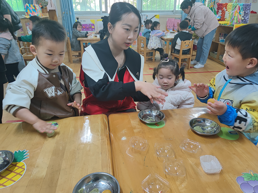 幼兒園的小朋友們和老師、社區(qū)工作人員一起,積極地參與到包青團(tuán)的過(guò)程中。幼兒園教師在現(xiàn)場(chǎng)耐心講解青團(tuán)制作的步驟,孩子們圍坐在一起,認(rèn)真聆聽(tīng)講解,觀看每一個(gè)步驟。隨后,在老師和工作人員的幫助下,小朋友們親手嘗試揉面、加餡、包團(tuán)子。雖然動(dòng)作略顯笨拙,但每個(gè)孩子都全神貫注,臉上洋溢著快樂(lè)的笑容。