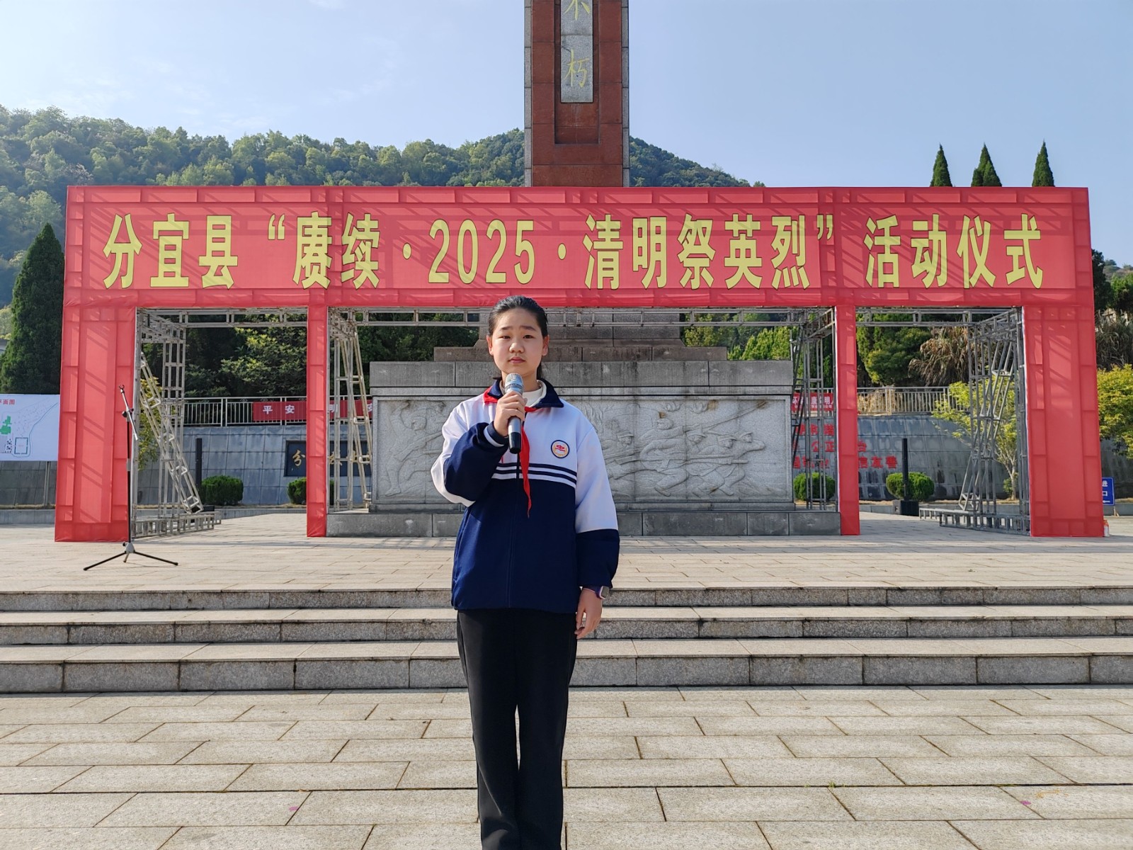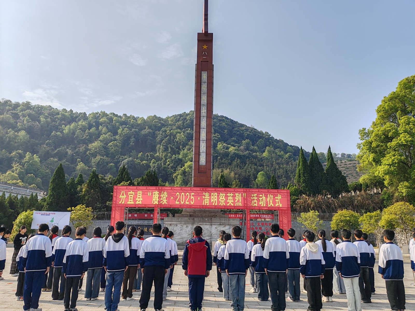 《義勇軍進(jìn)行曲》的激昂旋律在陵園上空奏響,師生們懷著無比崇敬的心情齊聲高唱,以歌聲向革命先烈致以最崇高的敬意。全體師生排列整齊,面向紀(jì)念碑低頭默哀。哀樂在陵園中低回,寄托著師生們對革命先烈的無盡追思。在這短暫的一分鐘里,同學(xué)們深刻感受到革命先烈為民族獨(dú)立、人民解放事業(yè)不惜拋頭顱、灑熱血的大無畏精神。
