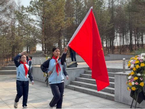 隨后,全體人員肅立于烈士陵園,伴隨《中國少年先鋒隊出旗曲》,少先隊員齊唱《我們是共產(chǎn)主義接班人》,表達對英烈的崇高敬意。少先隊員代表深情講述孫成有烈士的革命事跡,校外紅色輔導(dǎo)員紀(jì)雪嬌發(fā)出鮮花祭掃、綠色祭掃、網(wǎng)絡(luò)祭掃的文明倡議,倡導(dǎo)文明新風(fēng)。